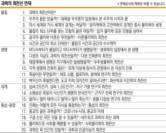 이에 생명의 탄생, 우주의 비밀, 인공지능의 미래 등 물질, 생명, 세계, 통섭·융합이라는 네 분야에 걸쳐 가장 중요한 스무 개의 질문을 던지고, 전공 과학자들이 직접 현대 과학이 어디까지 답하고 있는지, 말 그대로 ‘과학의 최전선’을 들려준다. 이는 연구실과 실험실의 과학을 넘어 인간과 세계에 대한 근원적 성찰을 지향한다. 이명현 과학책방 갈다 대표의 여는 글에 이어 김상욱 경희대 교수의 ‘미시 세계와 거시 세계’, 김항배 한양대 교수의 ‘시간과 공간’, 장대익 서울대 교수의 ‘다윈 진화론’, 김윤성 한신대 교수의 ‘종교와 과학’ 등 깊고 넓은 과학의 최전선이 이어진다.