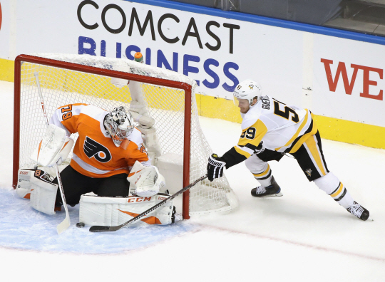 필라델피아 플라이어스의 골리 카터 하트(왼쪽)가 29일 오전(한국시간) 캐나다 온타리오주 스코샤뱅크 아레나에서 열린 피츠버그 펭귄스와의 북미아이스하키리그(NHL) 시범경기에서 제이크 겐츨의 슈팅을 막고 있다.
