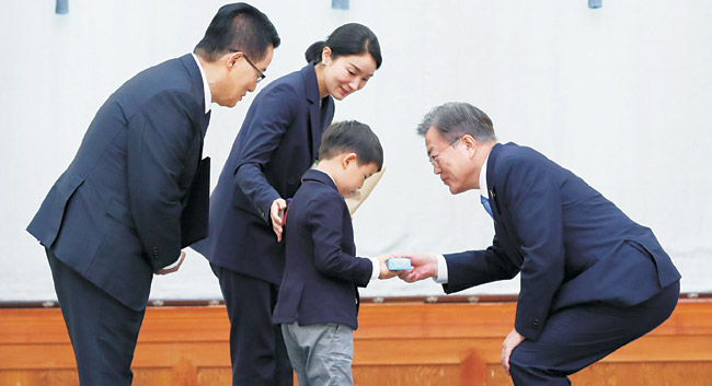 문재인 대통령이 29일 오전 청와대에서 박지원 신임 국가정보원장에게 임명장을 수여한 뒤 함께 참석한 박 원장의 손자에게 기념품을 건네고 있다.