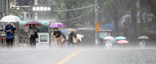 장맛비가 쏟아진 29일 오전 서울 중구 숭례문 도로위로 부서진 빗방울이 뿌옇게 보이면서 한 폭의 여름 장마철 풍경화를 연출하고 있다.