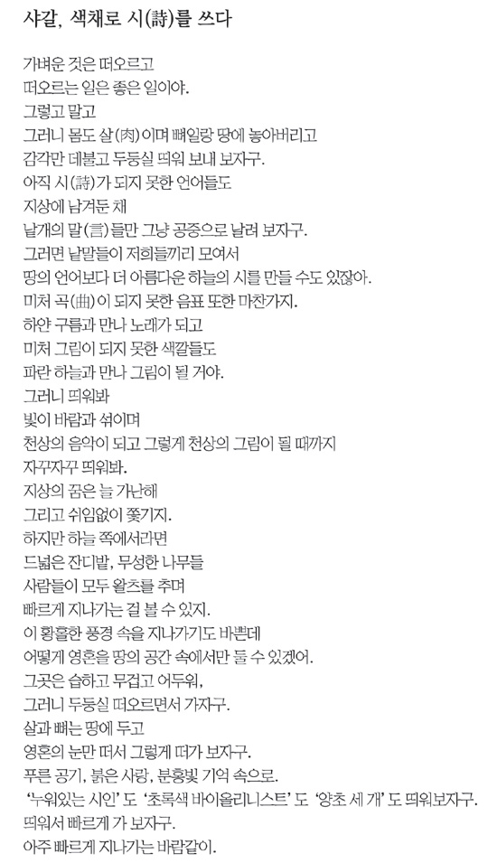 마르크 샤갈의 작품 앞에 서면 ‘나의 눈’의 구절구절이 떠오른다. 둥둥 떠다니는 사람들뿐 아니라 그 사람들 아래로 조개처럼 엎드려있는 집들이며 나무들도 신성의 오라에 반사되고 혹은 둘러싸여 있는 것만 같다. 집들이 말하고 나무는 노래한다. 색채의 낱말들이 저희끼리 만나 시가 된다. 그런데 그는 어떻게 빛과 색으로 그런 오라를 만들어 낸 걸까. 그도 그 위대한 분의 ‘만지심’을 체험했던 것일까. 아닌 게 아니라 사진으로 대하는 모습이지만 샤갈에게는 얼핏 유대교의 랍비나 가톨릭의 사제 같은 느낌이 들기도 한다.