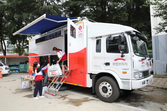 4일 유통업계에 따르면 롯데그룹은 충북지역 이재민을 위한 긴급 구호에 나섰다. 롯데는 충북지역 세븐일레븐 물류센터를 통해 지난 3일 컵라면과 즉석밥, 조미김 등 반찬류를 포함한 즉석 식품류 9000개를 긴급 지원했다. 앞서 지난달 31일에는 집중호우로 큰 피해를 입은 대전 서구 정림동 코스모스아파트에 세탁구호차량(사진)을 보내 지원활동을 펼쳤다.