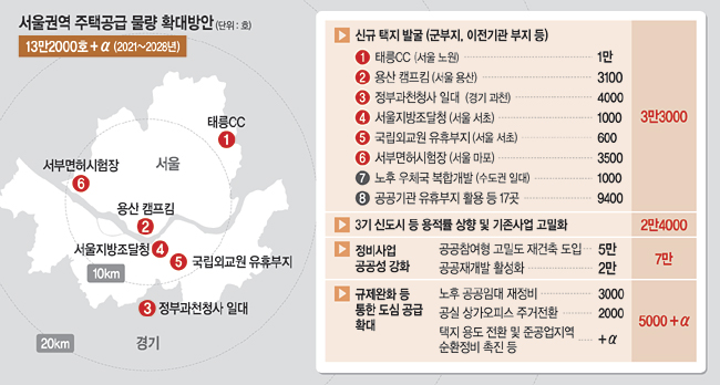 대책 수립 과정에서 계속 언급됐던 △태릉골프장 1만 가구 외에 △용산구 옛 미군기지 캠프킴(3100가구) △서초구 서울지방조달청(1000가구) △국립외교원 유휴부지(600가구) △정부과천청사(4000가구) △마포 서부면허시험장(3500가구 등) 및 공공기관 유휴부지 17곳(9400가구) 등도 주택단지로 개발된다. 과천청사 일대, 서울조달청, 국립외교원 등 정부 소유 부지는 최대한 청년과 신혼부부에게 공급한다는 방침이다. 상암DMC 부지(2000가구) 등 한국토지주택공사(LH)·서울주택도시공사(SH) 등 공공기관의 미매각 부지에서도 4500가구의 주택이 지어진다. 여기에 노후 우체국이나 공공청사 등을 주택과 복합개발하는 방식으로도 6500가구가 공급된다.