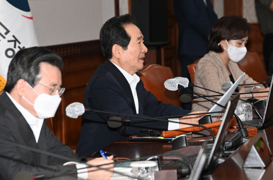 정세균(가운데) 국무총리가 4일 오전 정부서울청사에서 열린 국무회의에서 모두 발언을 하고 있다.