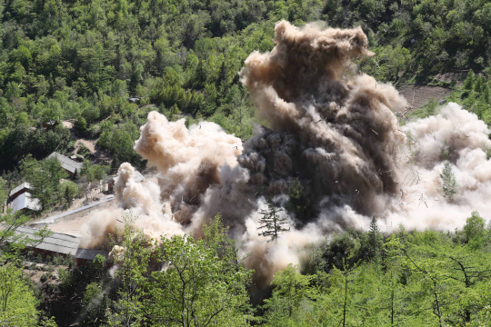 북한이 지난 2018년 5월 선제적 비핵화 조치를 주장하며 함경북도 길주군 풍계리 핵실험장을 폭파하는 장면. 그러나 4일 유엔 안전보장이사회 산하 대북제재위원회 전문가패널은 유엔에 제출한 중간보고서에서 풍계리 핵실험장이 “수개월 내 재건이 가능하다”고 평가했다.