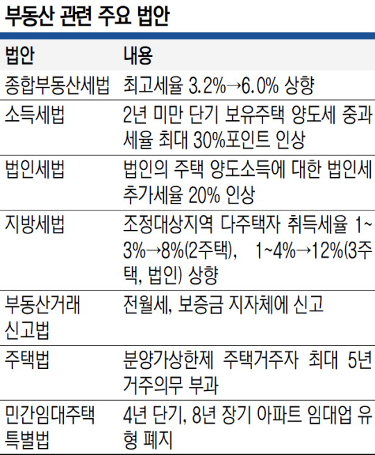 부동산 취득세율은 지방세법 개정안에 따라 2주택자는 현행 1∼3%에서 8%로, 3주택자 이상은 12%로 올라간다. 이달 1일부터 적용된다. 또 정부는 양도세 중과 방침에 따라 증여가 성행하자 이를 막기 위해 조정대상지역 내 공시지가 3억 원 이상 주택 증여 시엔 현행 3.5%에서 12%로 증여취득세를 중과시켰다. 내년 1월 1일부터는 법인의 주택 양도소득에 대한 법인세 추가세율이 현행 10%에서 20%로 인상하는 내용의 법인세법 개정안이 시행된다. 이어 내년 6월 1일부터 각종 증세 법안이 시행된다. 종합부동산세율을 최고 6%까지 올리는 내용의 종부세법 개정안이 대표적이다. 2주택 이상자에 대한 세율은 0.6∼3.2%에서 1.2∼6.0%로 두 배가량으로 높아지고, 조정대상지역의 경우 2주택자의 세 부담 상한이 200%에서 300%로 높아진다.