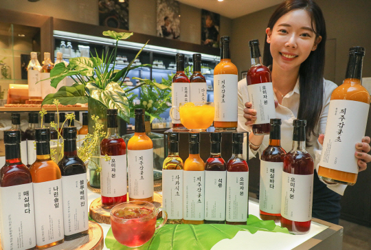 현대백화점 모델이 4일 서울 강남구 테헤란로 무역센터점 ‘명인명촌’ 매장에서 다양한 건강초와 건강청을 소개하고 있다.