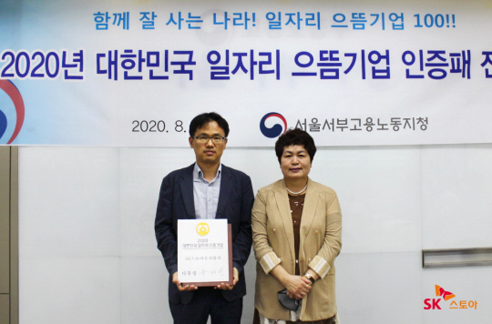 SK스토아는 고용노동부로부터 고용 창출과 일자리 질 개선 등에 기여한 공로를 인정받아 ‘2020년 대한민국 일자리 으뜸 기업’에 선정됐다고 4일 밝혔다. 지난 3일 서울 마포구 도화동 서울 서부 고용노동지청에서 열린 수여식에서 신양균(왼쪽) SK스토아 경영지원그룹장과 김영미 서울 서부 고용노동지청장이 기념사진을 찍고 있다.
