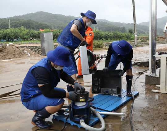 각 그룹은 성금 기탁뿐만 아니라 복구 지원에도 대대적으로 나서고 있다. 삼성전자는 집중호우 피해 지역에서 침수 가전제품 무상 점검·수리 서비스를 진행 중이다.(사진) 재난구호용 이동식 세탁 차량과 식사 차량도 보냈다. 삼성의료봉사단이 현지에 의료진을 파견하고, 삼성물산은 건설 중장비를 보낼 계획이다.