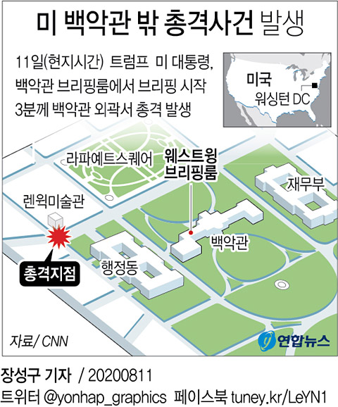 트럼프 대통령이 이날 신종 코로나바이러스 감염증(코로나19) 언론 브리핑을 시작한 지 3분만에 비밀경호국의 호위를 받아 돌연 브리핑장을 떠나면서 긴박한 상황이 연출된 바 있다.