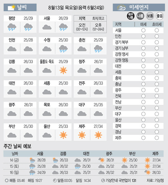 <날씨이야기>8월13일 목요일(음력 6월24일)