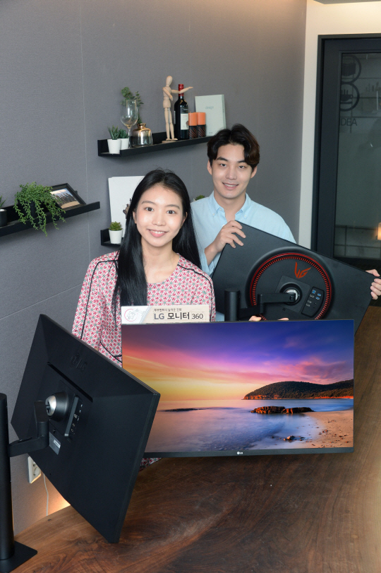 LG전자 모델들이 상·하·좌·우·전·후 6가지 방향으로 자유롭게 위치를 조절할 수 있어 공간 활용도는 물론 사용자 편의성까지 대폭 강화한 ‘360’ 모니터 시리즈를 17일 소개하고 있다.