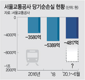 19일 서울교통공사와 서울시에 따르면, 올해 공사의 당기순손실은 사상 최초로 1조 원에 달할 것으로 예상된다. 2016년 이후 운임 수익은 해마다 2조 원대로 제자리걸음을 하고 있지만, 무임승차 손실 등으로 비용은 크게 증가하면서 2016년 3580억 원이었던 당기순손실이 2018년 5389억 원으로 증가한 데 이어 지난해엔 5865억 원까지 불어났다. 올해는 코로나19 때문에 이용객이 줄어들고 방역비용이 크게 늘어나면서 상반기(1∼6월)에만 4817억 원의 손실을 봐 시중에 ‘서울교통공사 부도설’이 퍼지기도 했다. 서울시가 나서 추경 예산을 편성해 방역비용 161억 원을 지원 결정했고, 감소한 운수 수입을 보전하기 위한 3657억 원 규모의 공사채 발행을 승인하면서 다행히 한숨은 돌렸다.