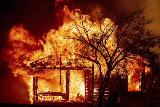 19일 미국 캘리포니아주 바커빌의 한 주택이 북부·중부를 덮친 대형 산불 가운데 가장 피해가 심각한 ‘LNU 번개 복합 파이어’로 화마에 휩싸여 불타오르고 있다. 이번 대형 산불로 서울 전체 면적(605㎢)의 약 두 배인 35만 에이커(1416㎢)가 탔다.