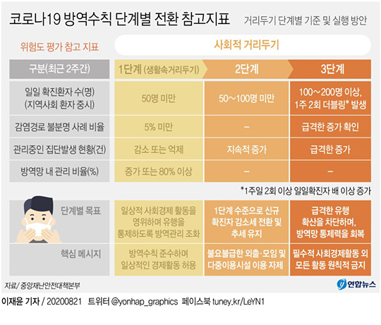 정부는 그동안 2주 평균 지역발생 일일 확진자 수가 ‘100∼200명’ 이상이면서 일일 확진자가 전날의 배가 되는 ‘더블링’ 현상이 일주일에 2번 이상 발생했을 때 의료 역량과 사회·경제적 비용 등 다양한 요소를 고려해 3단계를 결정한다고 설명해 왔다.