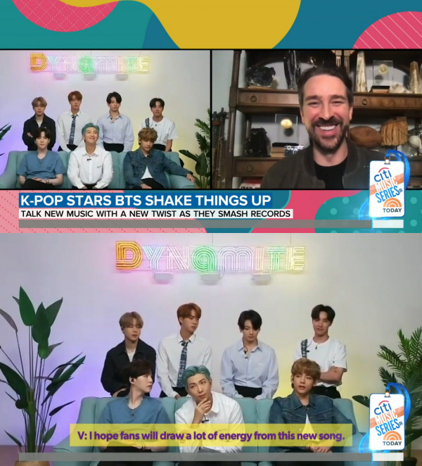 방탄소년단은 이날 화상 연결 방식으로 ‘TODAY Show’ 진행자 조 프라이어(Joe Fryer)의 질문에 성심성의껏 답변했다. 21일 전 세계에 동시 발매한 디지털 싱글 ‘Dynamite’의 소개를 비롯해 새로운 도전, 팬들에게 전달하고 싶은 메시지 등을 밝혔다.