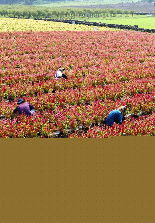 지난 한 달여간 4개의 태풍이 한반도를 강타하면서 큰 피해를 본 제주 서귀포시 표선면 보롬왓 농장 관계자들이 8일 강풍과 비바람에 쓰러진 맨드라미 꽃을 일일이 세우고 있다.