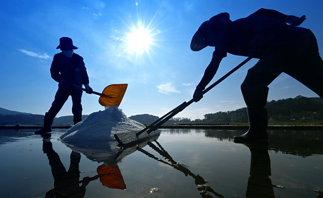 바닷물을 햇볕에 증발시켜 얻는 천일염은 날씨의 영향이 절대적인데 올여름엔 계속된 궂은 날씨로 공치는 날이 더 많았지요.