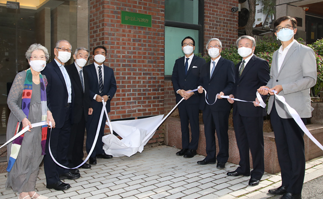 사진 왼쪽부터 송정숙 제6대 기금이사장, 김진현 제5대 이사장, 홍순일 제4대 이사장, 김진국 현 이사장, 정신영 기자 아들인 정몽혁 현대코퍼레이션그룹 회장, 창립 당시 실무 지원을 맡았던 이병규 문화일보 회장, 김창기 제13대 이사장, 박정훈 현 관훈클럽 총무.