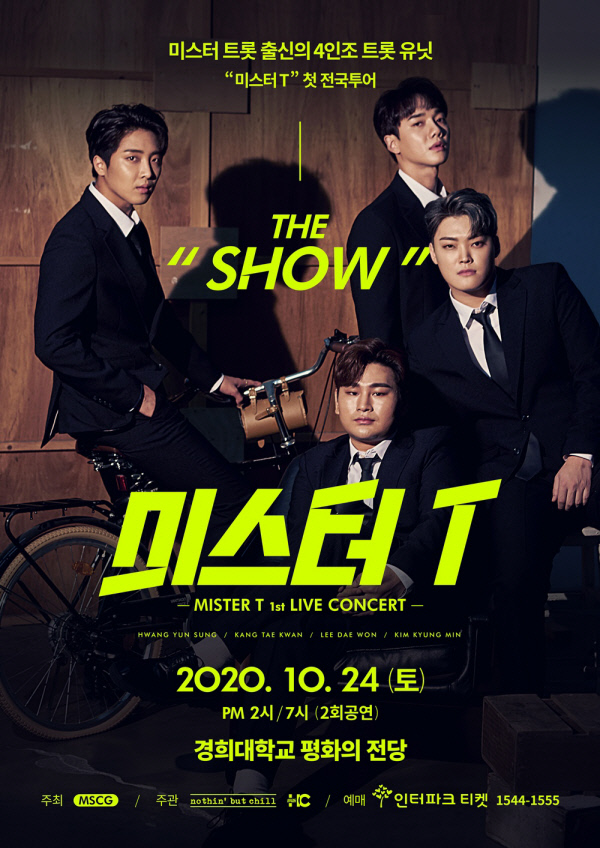 MSCG가 주최하고 nothin‘ but chill(낫띵벗칠), ㈜withHC(위드에이치씨)가 주관하는 ’The Show‘는 지난 6월 디지털 싱글 앨범 ’딴놈 다 거기서 거기‘를 발매하며 가요계에 정식 출범한 미스터T의 첫 단독 콘서트로, 10월 24일 오후 2시와 7시 경희대 평화의전당에서 개최된다.