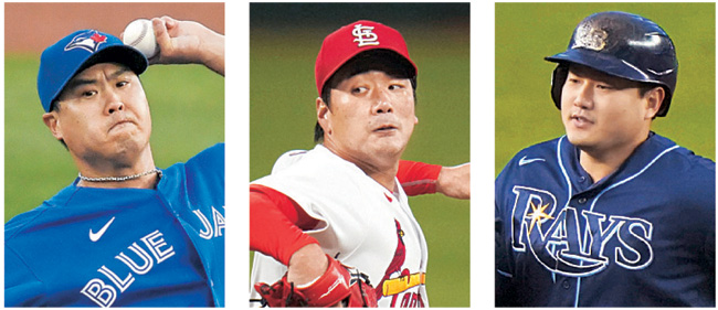 미국프로야구 메이저리그(MLB) 포스트시즌 대진표가 확정됐다. 류현진(33·토론토 블루제이스·왼쪽 사진), 김광현(32·세인트루이스 카디널스·가운데), 최지만(29·탬파베이 레이스·오른쪽)이 가을무대를 밟는다.