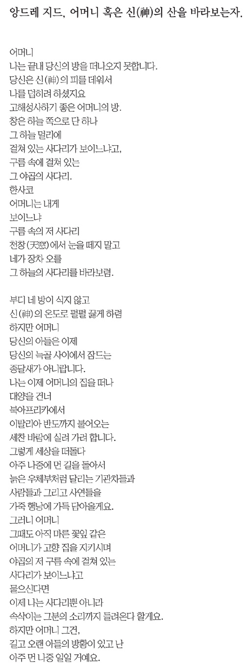 허다한 문학 소년들이 그러하듯이 나 역시 중·고등학교 시절 앙드레 지드와 헤르만 헤세라는 두 문을 통과해야 했다. 특히 ‘좁은문’을 읽으며 나는 작가가 육친적으로 다가오는 느낌을 받곤 했다. 그는열한 살 때 아버지와 사별한 후 그야말로 독실한 외골수 프로테스탄트였던 홀어머니 아래서 기독교적 세계관의 교육을 받았는데 나 역시 만 열한 살에 아버지를 여의고 어머니 손에 잡혀 교회에 드나들었기 때문이다. 육체적 욕망의 자아와 청교도적 삶의 가르침 속에서 방황하던 ‘좁은문’의 제롬과 알리사는 우리 시대 젊은이의 초상이기도 했고 동시에 동방의 시골 소년이었던 나의 초상이기도 했다.