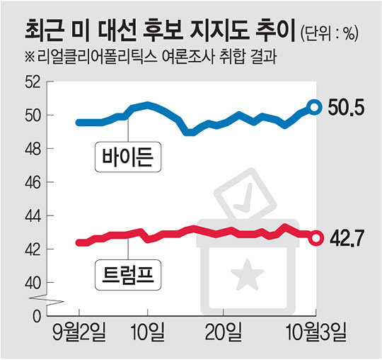 조 바이든 미국 민주당 대선후보가 도널드 트럼프 대통령이 신종 코로나바이러스 감염증(코로나19)에 확진되고 최근 여론조사 지지율 등에서 열세를 보이자 ‘승기를 잡았다’고 판단해 경합주인 플로리다(5일), 애리조나(8일) 등의 선거 유세에 적극적으로 나설 계획이다. 전문가들은 “트럼프가 과거 바이든을 두고 지하실에 틀어박혀 현장에 나오지 않는다고 비방했지만, 이제는 상황이 완전히 역전됐다”고 말했다.