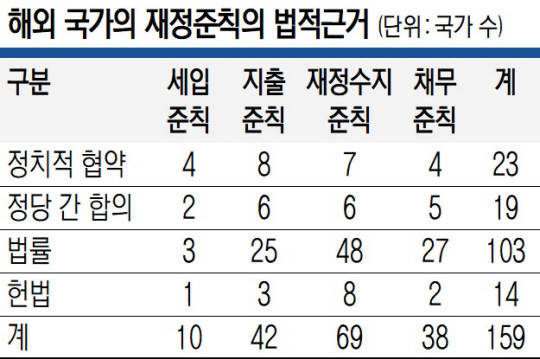 5일 국회 기획재정위원회의 ‘재정건전화법안·국가재정법 일부 개정법률안 검토 보고’에 따르면, 재정준칙을 가진 159개국 중에서 법률에 근거를 두고 있는 국가는 103개국, 헌법에 근거를 두고 있는 국가는 14개국이었다. 법률과 헌법에 근거를 두고 있는 국가(117개국)의 비중이 전체의 73.6%에 달했다. 그 이외의 국가는 정치적 협약(23개국), 정당 간 합의(19개국) 등이었다. 해외에서 이처럼 법률과 헌법에 재정준칙의 근거를 두는 이유는 법적으로 강제하지 않으면 위정자들이 재정준칙을 어길 가능성이 그만큼 크기 때문으로 풀이된다.