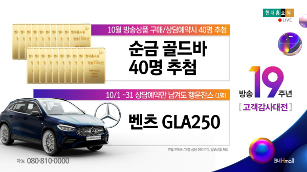 현대홈쇼핑은 특별 방송과 함께 다양한 구매 혜택을 제공하는 고객감사대전을 10월 한 달 동안 연다고 5일 밝혔다. 먼저 TV홈쇼핑과 T커머스 채널인 ‘현대홈쇼핑플러스샵’, 종합인터넷쇼핑몰인 현대H몰에서 방송 상품을 3가지 이상, 30만 원 이상 구매하면 ‘이녹스프랑 대용량 에어프라이어(5.5ℓ)’ 또는 ‘이녹스프랑 도마·나이프 살균건조기’를 증정한다. 방송 상품을 구매하거나 렌털 상품 상담 예약 고객 중 추첨을 통해 총 40명에게 ‘24K 순금 골드바(18.75g)’를 증정하는 경품 행사도 마련했다. 그중 렌털 상품을 상담 예약한 고객들을 대상으로는 또 다른 추첨을 통해 5000만 원 상당의 자동차(벤츠 2020 GLA 4MATIC, 1명)도 준다. 추첨 결과는 오는 11월 초 현대H몰을 통해 발표되며, 당첨 고객에게는 개별 연락으로 공지할 예정이다.
