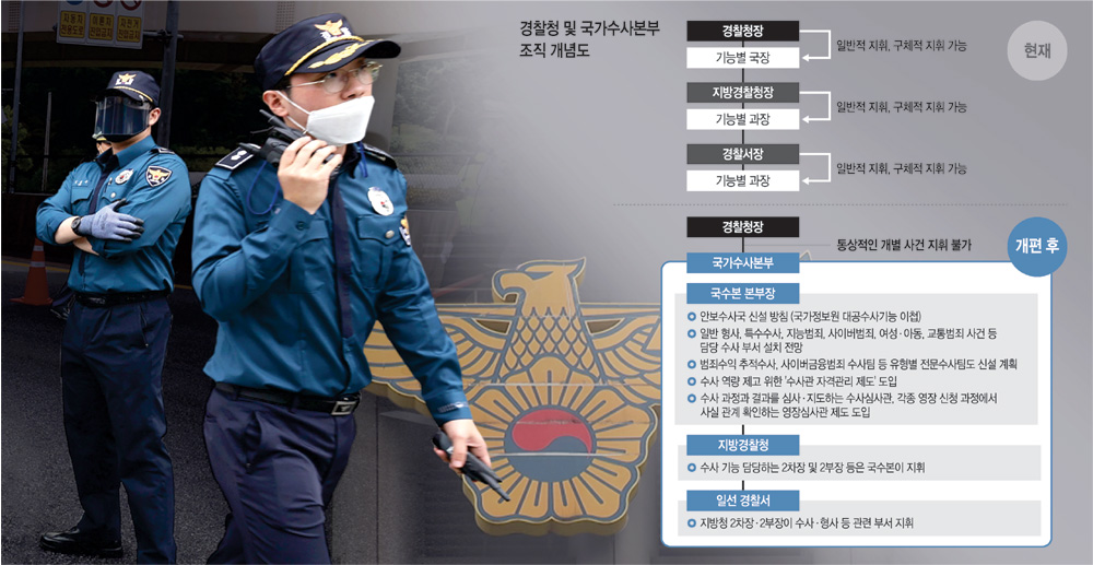 경찰청 산하에 설치될 예정인 국수본은 경찰 수사를 총괄하는 국수본 본부장을 정점으로 경찰의 모든 수사 기능이 집중되는 구조로 설계되고 있다. 본부장(치안정감급)은 3년 단임제로 외부 전문가에게도 개방한다. 수사에 관해 시·도경찰청장·경찰서장 및 수사부서 소속 공무원을 지휘·감독하도록 해 전문적인 수사지휘 체계를 갖추게 했다. 임기 2년의 경찰청장(치안총감)은 개별 사건에 대한 구체적인 수사지휘권을 원칙적으로 폐지한다. 수사의 중립성과 독립성을 확보한다는 취지이나 사실상 임기가 더 긴 국수본 본부장이 경찰 조직 최대 실세로 떠오를 것이란 관측이 출범 전부터 경찰 안팎에서 나오고 있다.