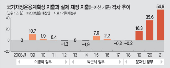 계획과 현실의 큰 괴리는 이전 정부와 비교해도 현저히 드러난다. 박근혜 정부의 경우 국가재정운용계획과 지출 예산이 가장 차이가 많이 났던 때도 차액이 7조 원(2015년)에 불과했다. 박근혜 정부 마지막 해인 2017년엔 본예산 기준 지출이 400조5000억 원으로 취임 초 계획했던 400조7000억 원보다 오히려 줄었다. 이명박 정부 역시 글로벌 금융위기였던 2009년에 국가재정운용계획상 지출 예정액과 본예산 기준 재정 지출액이 10조7000억 원의 격차가 난 것을 제외하면 대체로 1조~2조 원의 격차만 보였다.