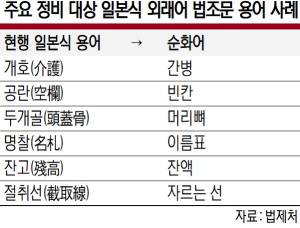 법제처는 잘못된 법률 용어 문제를 해소하고자 2006년부터 ‘알기 쉬운 법령 만들기’ 사업을 벌이고 있다. 올해도 한글날을 앞두고 ‘공란’ ‘두개골’ 등 일본식 용어를 고유어인 ‘빈칸’ ‘머리뼈’로 다듬고, ‘개호’는 이해하기 쉬운 한자어인 ‘간병’으로 바꾸는 등 법령 속 일본식 용어를 정비하겠다고 발표했다.