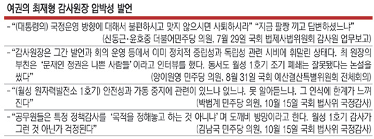 16일 주호영 국민의힘 원내대표는 “(감사원의 월성 1호기 관련 감사 등) 이처럼 중요한 정책 결정 과정은 국민 앞에 한 점 감춤 없이 공개돼야 한다”며 “감사 저항 과정의 불법에 대해선 감사원이 고발 조치해 수사로 옮겨지도록 해야 한다”고 밝혔다. 법사위원인 같은 당 전주혜 의원도 이날 원내대표단 회의에서 “국민의힘은 감사 결과를 검토한 뒤 모든 자료 공개 청구를 할 예정”이라며 “법사위 의결로 이를 공개해 어떤 조직적 저항과 사실 왜곡이 있었는지 파헤치겠다”고 말했다. 이는 최재형(사진) 감사원장이 전날 국감에서 월성 1호기 감사 관련 모든 자료를 공개하겠다고 밝힌 데 따른 움직임이다.