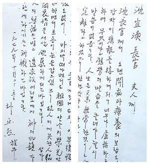 심장관 부인에 친필 위로 서신