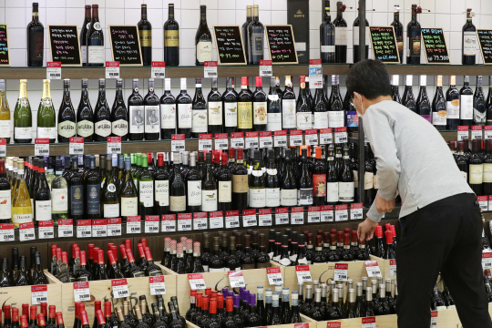 15일 서울 중구 롯데마트 서울역 와인 매장에서 한 고객이 와인을 살펴보고 있다. 16일 관련 업계에 따르면 신종 코로나바이러스 감염증(코로나19) 여파로 외부 식당 대신 집에서 와인을 즐기는 소비자가 늘어나면서 롯데마트, 이마트 등 대형마트들은 와인장터를 마련하고 50∼70% 할인된 가격에 와인을 판매하는 등 대규모 행사에 나섰다.