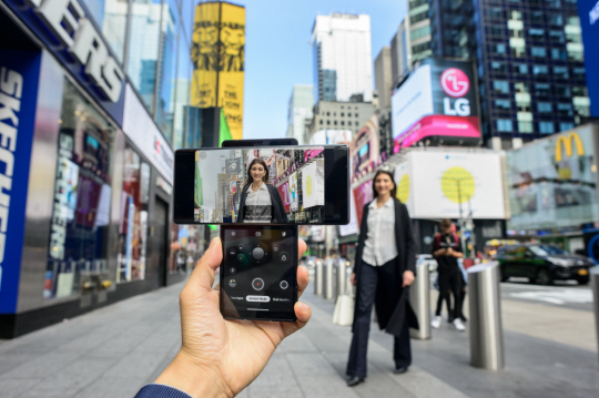 LG전자가 15일(현지 시간 ) 미국 시장에서 하반기 전략 스마트폰 ‘LG 윙(LG WING)’을 출시했다. LG 윙 홍보 모델이 미국 뉴욕 타임스퀘어 광장에서 LG 윙을 소개하고 있다.