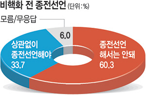 2일 문화일보 창간 여론조사에서 문재인 대통령이 강력하게 추진 중인 종전선언과 관련, ‘북한의 비핵화 진전 없는 종전선언에 가장 반대한다’는 응답(60.3%)이 ‘비핵화 진전과 상관없이 추진해야 한다’는 답변(33.7%)보다 배가량으로 많았다.
