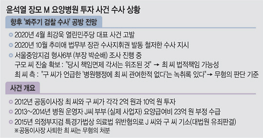 3일 문화일보 취재에 따르면 이 사건을 수사 중인 서울중앙지검 형사6부(부장 박순배)는 최근 최 씨의 동업자와 요양병원 운영자 등을 잇따라 소환 조사했다. 특히 이 과정에서 검찰은 최 씨와 함께 요양병원 공동이사장을 지낸 구모 씨로부터 “책임면제각서는 위조된 것”이라는 취지의 진술을 확보하고 수사를 진행하고 있는 것으로 알려졌다. 최 씨는 2015년 경찰과 검찰 수사 당시 ‘병원 운영과 관련해 법적 책임을 묻지 않는다’는 내용의 책임면제각서를 제출했다. 경찰은 수사 결과 최 씨가 요양병원 운영에 개입하지 않았으며 오히려 투자금을 돌려받지 못한 피해자에 가깝다고 봤고 검찰도 이를 그대로 인정하면서 최 씨를 기소하지 않았다. 특히 최근 검찰 조사에서 “최 씨에게 책임면제각서를 써준 적이 없다”고 진술한 구 씨가 이와는 반대되는 취지의 발언을 한 녹취록이 확인되면서 진술의 신빙성에 의문이 제기되고 있다. 구 씨는 2017년 7월 최 씨와의 전화통화에서 “요양병원 행정에 대해 관여한 바가 없다고 각서를 써준 것이 있지 않느냐”는 최 씨의 물음에 “그런 게 있다”고 대답한 것으로 알려졌다. 실제로 윤 총장의 장모 최 씨가 병원운영에는 관여하지 않았다는 것이다. 최 씨 측은 해당 녹취록에 대해 이미 속기사무소의 공증을 거친 상태로 이를 검찰에 제출할 방침이다. 최 씨 측은 문화일보와의 통화에서 “정치적 사건으로 프레임이 뒤바뀌어버려 답답하다”면서도 “검찰 측에서 부른다면 관련 자료를 제출하고 성실하게 응할 방침”이라고 밝혔다.