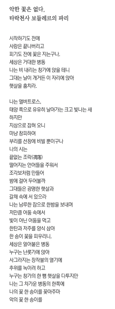 ‘악의 꽃’에는 ‘앨버트로스(Albatross)’라는 거대한 바닷새 이야기가 나오는데 창공을 유유히 날던 이 우아한 새가 뱃사람들의 갑판 위에 잡혀 묶인 채 그 아름답고 큰 날개를 노처럼 질질 끌게 된다고 묘사하며 대양을 큰 새처럼 날아야 하는 자신이 지상에 묶여 온갖 조롱과 비아냥을 듣는 것과 같다고 썼다. 시집 ‘악의 꽃’은 이처럼 생에 대한 거부와 연민을 담은 30여 편의 시로 이뤄져 있다.