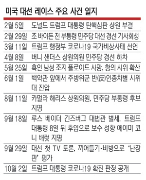 대선 여정도 다사다난했다. 트럼프 대통령은 우크라이나 스캔들을 발단으로 탄핵 위기에 직면했으나 상원에서 기각됐다. 바이든 후보는 민주당 대선 경선 초반 저조한 성적을 기록했으나 기사회생해 대선후보가 됐다. 지난 5월 흑인 남성 조지 플로이드가 경찰의 과잉진압으로 숨진 후 인종차별 반대 시위가 이어졌다. 인종 문제가 대선 쟁점으로 떠오르자 카멀라 해리스 상원의원이 최초의 여성이자 유색인종 부통령 후보가 됐다.