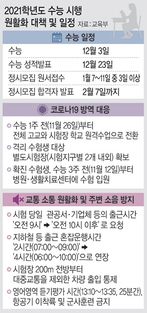 정부는 신종 코로나바이러스 감염증(코로나19) 시대 첫 대학수학능력시험(수능)을 맞아 시도별 확진·격리 수험생 규모를 철저히 파악·분석해 일반시험장 외 별도의 시험장을 마련, 모든 수험생의 응시기회를 보호하면서 방역 안전을 지키겠다는 방침을 밝혔다. 수능 일주일 전에 전국 고등학교를 사실상 폐쇄하는 등 강력한 대책을 내놓은 것은 수능을 한 달 앞두고 학교 내 감염병이 확산하는 추세를 보이고 있어 교육 당국의 수능 고사장 방역에 비상이 걸렸기 때문이다.