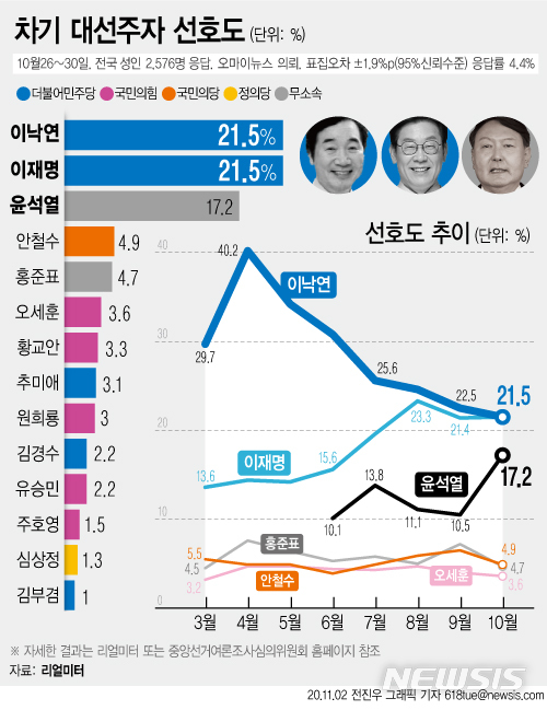 2일 여론조사업체 리얼미터가 발표한 10월 차기 대선주자 선호도에 따르면, 이낙연 대표는 지난 9월 대비 1.0%포인트 하락한 21.5%를 기록, 0.1%포인트 상승해 전월과 비슷한 선호비율을 보인 이재명 지사(21.5%)와 공동 1위를 차지했다.