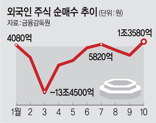 금융감독원이 9일 발표한 ‘10월 외국인 증권투자 동향’에 따르면 외국인은 지난달 유가증권시장(코스피)에서 1조620억 원, 코스닥시장에서 2960억 원을 각각 순매수했다. 외국인의 국내 주식 보유 규모는 시가총액의 30.4%에 달해 국내 증시 움직임에 큰 영향을 준다. 금감원은 달러화 약세, 경제 회복, 기업실적 개선 등을 주요 원인으로 분석했다.