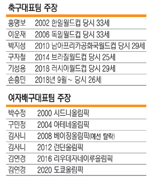 대표팀은 여러 구단에서 선발된 자원이 모인다. 소속팀에서 시즌을 치러야 하기에 모였다 해체하기를 반복한다. 대표팀보다 소속팀에 머무는 기간이 길기에 주로 대표팀 감독이 주장을 뽑는다. 감독은 신뢰가 높고, 책임감이 뛰어난 선수에게 완장을 준다. 축구는 4년마다 열리는 월드컵이 주장 교체, 즉 선임 시점이다. 월드컵이 끝나면 사령탑이 교체되고, 새로 부임한 감독은 새로운 주장을 뽑는다. 러시아월드컵은 2018년 7월에 끝났고, 손흥민(28)은 두 달 뒤 새 대표팀의 주장이 됐다.