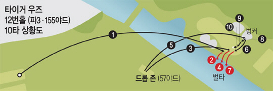 155야드로 세팅된 12번 홀에서 우즈의 티샷은 그린에 약간 못 미쳐 경사를 타고 흘렀고 그린 앞 ‘래의 개울’(Raes Creek)로 들어갔다. 악몽의 시작. 1벌타를 받고 57야드 지점의 드롭존에서 친 3번째 샷도 그린에 떨어진 뒤 다시 아래로 굴러 물속에 빠졌다. 다시 벌타를 받고 친 5번째는 길었고 그린 뒤편 벙커로 들어갔다.