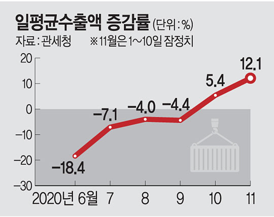 관세청이 16일 발표한 ‘10월 수출입 동향’(확정치)에 따르면, 10월 수출액은 지난해 동월과 비교해 3.8% 감소한 448억9900만 달러를 기록했다. 다만 10월 초 추석 연휴가 끼어 있었음을 고려하면 선방한 것이라 평가받는다. 실제로 조업일수를 고려한 하루 평균 수출액은 21억4000만 달러로 지난해 같은 기간 대비 5.4% 증가했다. 코로나19 사태 이후 일평균 수출액이 플러스로 전환한 것은 처음이다. 11월 1~10일(잠정치) 일평균수출액도 12.1% 증가하며 순항을 이어가고 있다.