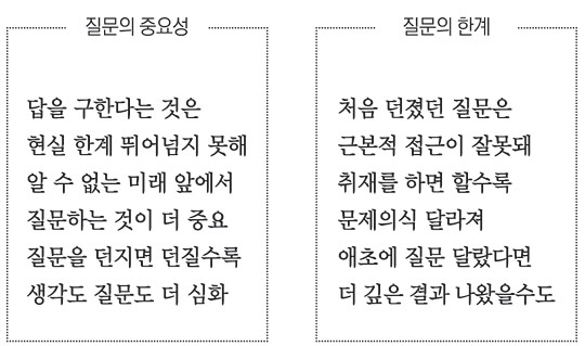 ◇최현미 문화부장 = 사전 취재를 통해 질문을 만들고, 다시 취재하고, 이에 대한 결론을 찾아가면서 단계마다 질문의 중요성을 더욱 절감했다. 한국 사회는 이제까지 질문을 던지는 것보다 답을 찾는 것에 익숙했다. 정답을 찾고 정답인 길로 가려고만 했다. 하지만 답은 현실의 한계를 뛰어넘기는 어렵다. 답을 구한다는 것은 우리가 이미 알고 있는 범위 내의 지식과 정보를 분석하고 조합한 결과이기 때문이다. 특히 그 어느 때보다 불확실성이 증폭되고 있는 지금은 답을 구하는 것보다 질문을 던지는 것이 더 중요해졌다.