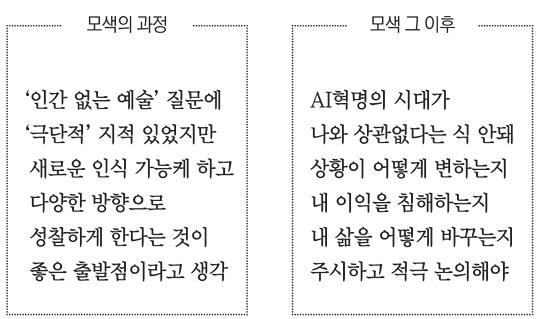 ◇최현미 = ‘인간 없는 예술은 가능하냐’라는 질문은 비교적 빨리 만들었는데 취재하면서 이 질문을 계속 의심했다. 과연 유효한가, 의미 있나, 적절한가, 우리를 평소 생각지 못한 먼 곳으로 데려다줄 수 있느냐는 생각을 했다. 취재원들은 대부분 흥미로운 질문이라고 했지만, 잘못된 질문이라고 말하는 이들도 있었다. 질문이 너무 극단적이어서 오히려 기계에 대해, 인간 외 존재에 대한 반발을 부르고 공포를 느끼게 할 수 있다는 지적이었다. 하지만 이 질문에는 이 같은 공포까지 포함해 인간과 기계, 인간의 창조성과 기계의 창발성, 그리고 인간과 동물의 관계, 인간 외 존재에 대한 새로운 인식 등 여러 문제와 고민이 들어가 있었고, 또 다양한 방향으로 생각하게 한다는 점에서 좋은 출발점일 수 있다고 생각했다.