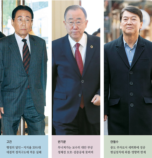 2017년 1월 귀국한 반 전 총장이 본격적인 대권 행보를 보이자 검증 과정에서 모호한 정체성에 대한 문제 제기와 여러 논란이 불거졌다. 반 전 총장은 검증 공세를 버티지 못해 귀국 3주 만인 2월 1일 돌연 불출마를 선언했다. 반 전 총장은 대선 불출마 선언 기자회견에서 “저의 순수한 애국심과 포부는 인격살해에 가까운 음해, 각종 가짜 뉴스로 인해 정치 교체 명분은 실종됐다”고 밝혔다. 반 전 총장을 추종하던 세력은 정신적 공황 상태에 빠졌다. 고 전 총리와 마찬가지로 정통 관료의 한계를 그대로 노출한 것이란 평가가 나왔다.