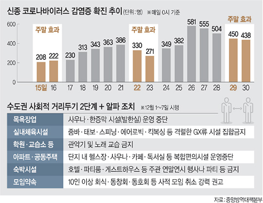 감염 사례가 이어지면서 주말 검사 건수 축소 효과에도 불구하고 전국의 확진자는 400명대를 유지했다. 특히 지역 발생 환자는 전날(413명)에 비해서도 오히려 1명이 늘었다. 주말 추이만을 보고 500명대에서 400명대로 감소세에 접어들었다고 판단하기에는 이르다는 분석이 제기되는 이유다.